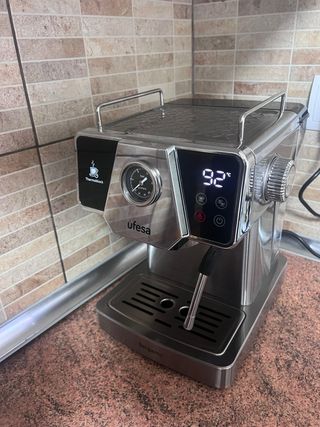 Cafetera de espresso Ufesa con acabado en acero inoxidable. Le falta el brazo de hacer un solo café pero el de dos va perfecto - Diseño moderno y compacto. - Panel de control con indicadores luminosos. - Vaporizador para espumar leche.