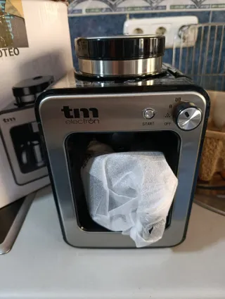 Cafetera de la marca TM Electron con molinillo integrado. Diseñada para preparar café fresco. - Molinillo incorporado. - Diseño moderno y compacto. - Panel de control con selector de molienda y temporizador.