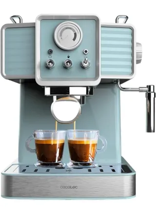 Cecotec Cafetera Express Power Espresso 20 Tradizionale Light Blue en color azul pastel y acabado plateado. - Diseño retro. - Incluye manómetro para controlar la presión. - Vaporizador orientable para espumar leche. - Bandeja de goteo extraíble.