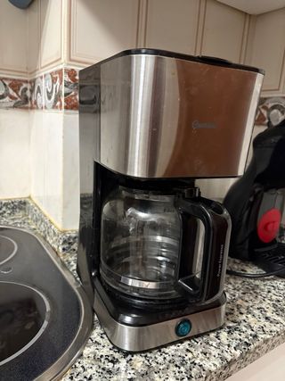 Cafetera de goteo con jarra de cristal. - Diseño moderno en acero inoxidable y negro. - Jarra de vidrio resistente. -La jarra tiene una grieta pero no está roto del todo (se puede cambiar).