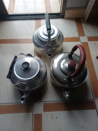 Conjunto de tres cafeteras de aluminio, perfectas para tu cocina. - Cafetera con asa negra. - Cafetera con asa roja. - Cafetera con tapa plateada.