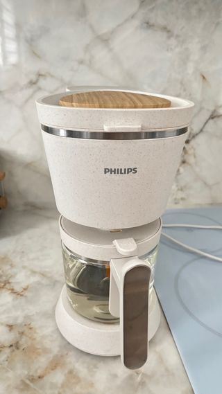 Cafetera Philips en excelente estado, utilizada solo dos veces. - Diseño moderno y compacto. - Tapa superior de madera. - Jarra de cristal.