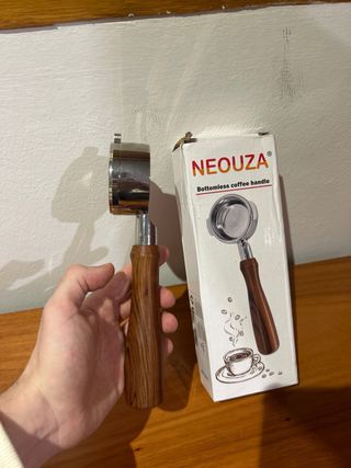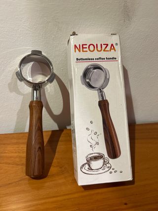 Portafiltro sin fondo de 51 mm para cafeteras espresso profesionales o semiprofesionales, con mango de madera de alta calidad. Lo vendo porque no me sirve para mi cafetera. - Mango de madera con veteado natural. - Aro de acero inoxidable.