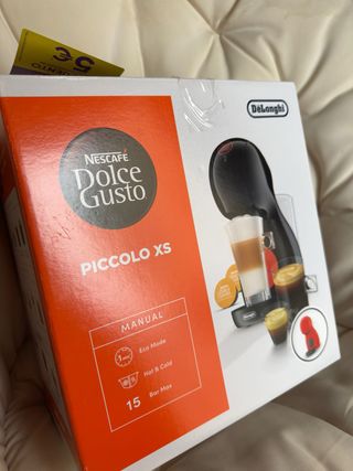 Cafetera Dolce Gusto Piccolo XS De’Longhi en rojo intenso (modelo compacto y bonito). Usada muy poquito (unas pocas veces nada más), en perfecto estado funcional y estético, como nueva. Incluye: • Caja original • Manual • Soporte cápsulas • Bandeja antigoteo • Cable Características rápidas: • Preparación caliente y fría • Muy fácil de usar y limpiar Ideal para espressos, cappuccinos, lattes o bebidas Starbucks.