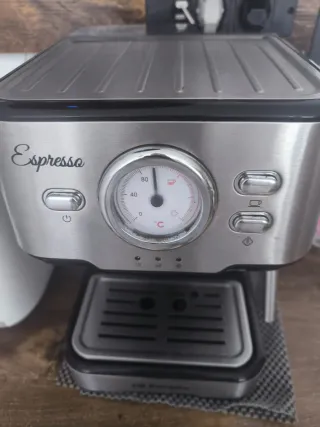 Cafetera express Aeomjk, prácticamente nueva. Ideal para preparar deliciosos cafés en casa. - Usada 4 veces para probarla - Diseño elegante y compacto en acero inoxidable. - Fácil de usar con botones intuitivos. - Incluye accesorio para vapor.