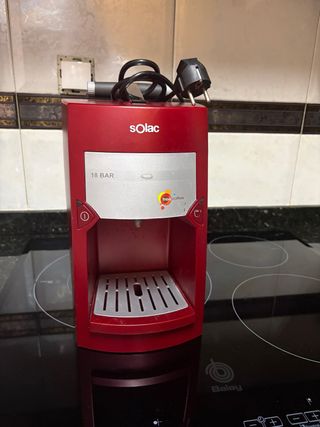Cafetera Solac en color rojo, ideal para preparar espressos con monodosis. - Modelo: Cafetera espresso para monodosis. - Presión: 18 BAR. - Tipo de café: Monodosis ESE. - Incluye prensa.