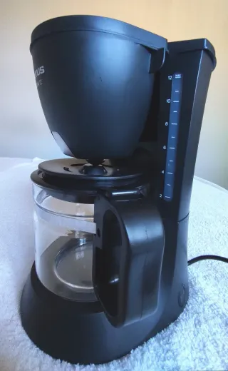 Cafetera eléctrica de la marca Philips, con jarra de cristal y depósito de agua. - Mide 27 cm. de alto - Color marrón. - Indicador de nivel de agua. - Filtro permanente.