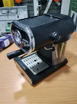 Cafetera express de color negro con detalles cromados. - Diseño moderno. - Bandeja de goteo extraíble. - Depósito de agua transparente.