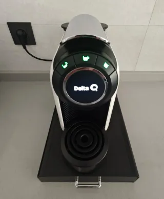 Cafetera de cápsulas Delta Q en color blanco y negro. Incluye un cajón organizador con cápsulas. - Diseño moderno. - Cajón con capacidad para 30 cápsulas. - Incluye varias cápsulas de café(50aprx)