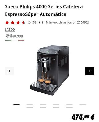 CAFETERA ESPRESSO SUPER AUTOMÁTICA serie 4000 Potencia máxima 1850 W Capacidad del depósito 1.8 l Número de tazas máx 2 Presión 15 bar Molinillos 100 % cerámicos para ofrecer un rendimiento duraderoAjusta la boquilla de salida del café para que encaje con cualquier taza Espuma de leche deliciosa gracias al espumador de leche clásico CoffeeSwitch ESTUPENDO CAFE ESPRESSO variedades de café Bebidas Cappuccino Espresso Espresso largo Agua caliente Espuma de leche Opción para café en polvo Sí Función de dos tazas Sí Función de dos tazas para leche No Descafeinado con el mismo sabor gracias a la opción de café en polvo Café caliente...