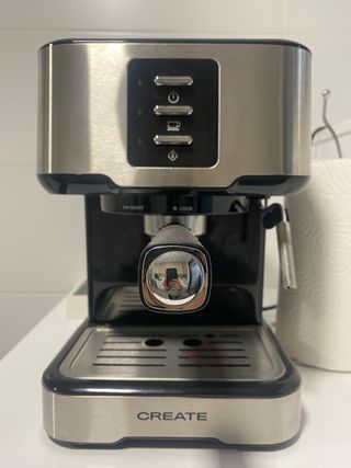 Cafetera de la marca Create, diseñada para café molido. Su acabado en acero inoxidable le da un toque moderno y elegante a tu cocina. - Cuerpo principal de acero inoxidable. - Panel de control con botones. - Bandeja de goteo extraíble. - espumador de leche -contenedor de agua - regulador espumador de leche para mas densidad