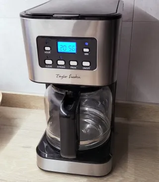 Cafetera eléctrica de la marca Taylor Swoden, modelo Darcy. Solo 3 usos. Está nueva. - Capacidad 1,5 litros, 12 tazas. - Función autolimpieza - Programable para hacer café a la hora deseada - Función mantener caliente - Función para hacer café con sabor más intenso - Función pausar y servir mientras se hace el café - Panel de control con pantalla digital - Jarra de cristal con asa ergonómica