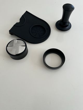 Conjunto de accesorios 58mm para máquinas de café espresso. - Base de silicona para manipulación. - Tamper de café. - Anillo dosificador. -Distribuidor de café
