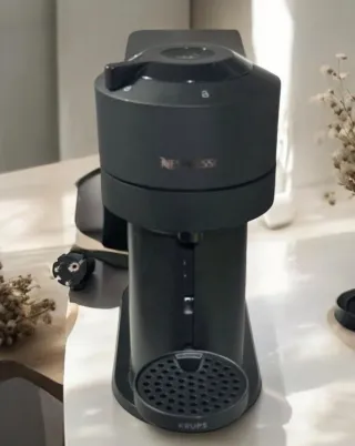 Cafetera Nespresso Vertuo Next de Krups en color negro mate. Diseño moderno y compacto. Regalo kit limpieza descalcificador para eliminar la cal y garantizar que la máquina ofrezca un café de gran sabor. También regalo algunas cápsulas de chocolate y descafeinado.