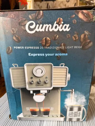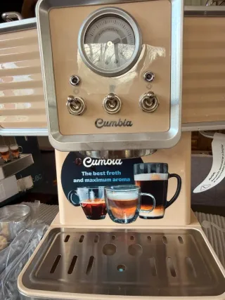 Cafetera espresso Cumbia 20 Tradizionale en color beige claro. Diseño retro. Sacado solo para probarla y para la foto. - Bomba de presión. - Vaporizador para leche - Tiene ese relojito vintage en el frontal que te indica la presión exacta en tiempo real. ¡Muy pro! -Prepara uno o dos cafés a la vez sin esperas. - No es una cafetera cualquiera; tiene potencia de sobra para sacar toda la crema y el aroma (nada que envidiar a las cafeterías)