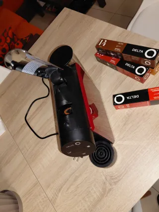 Cafetera de cápsulas Delta. Se ha usado poco. No dispongo de la caja, por eso su bajo precio. El precio incluye las cajas de cápsulas de café Delta Q. - Intensidades disponibles: 10, 12 y 14. - Variedades: Qalides, Qharisma y Qharacter. - Incluye 60 cápsulas en total.