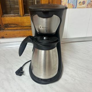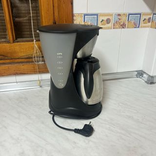 Cafetera eléctrica diseñada para preparar café por goteo. Tiene una jarra térmica de acero inoxidable para mantener el café caliente durante más tiempo. Marca Norm. Tiene capacidad para más de 1 litro de agua. Está bien cuidada y funciona perfectamente. El diseño combina acero inoxidable y plástico negro.