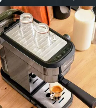 Cafetera de espresso con un diseño retro y elegante, perfecta para tu cocina. Prepara deliciosos cafés con facilidad. - Acabado en color beige y detalles cromados. - Incluye vaporizador para espumar leche. - Bandeja recogegotas extraíble.