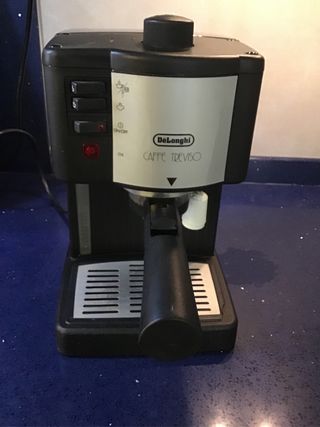 Cafetera Delonghi Caffé Treviso, ideal para piezas o reparación. Funciona perfectamente pero pierde vapor por el cazo del café. - Color negro y plateado. - Marca: DeLonghi. - Modelo: Caffé Treviso.