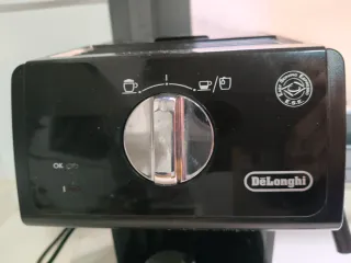 Cafetera DeLonghi en color negro, con un diseño moderno y compacto. - Panel de control con selector. - Incluye portafiltro. - Marca: DeLonghi. La tapadera superior está rota, pero funciona perfectamente y no supone nada.