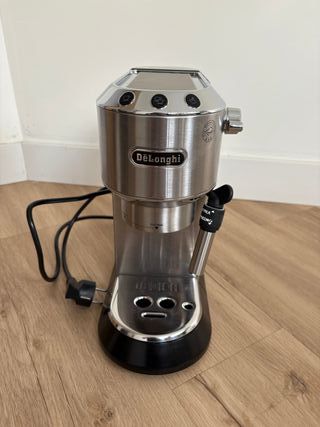 Cafetera espresso compacta de la marca DeLonghi, modelo Dedica. - Perfecto estado. Su diseño es elegante y ocupa poco espacio. - Acabado en acero inoxidable. - Panel de control con botones. - Vaporizador para leche.