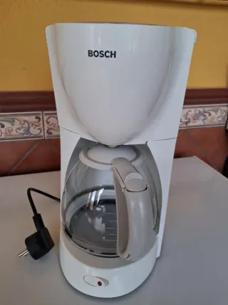 Cafetera de goteo en color blanco de buena marca Bosch. Electrica. Con deposito para echar el cafe directamente o usar filtro de papel. Hasta 12 tazas. Con interruptor. 800W. Funciona perfectamente. Poco usada. La jarra tiene un golpecito con grieta, pero no se sale el agua, es interior. Rebajada 18€. Recoger en Marbella Hago envio.