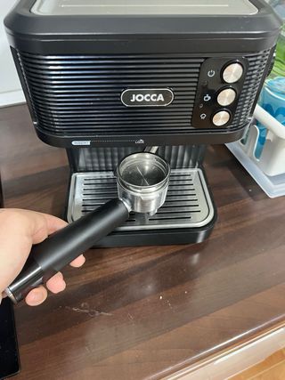 Cafetera espresso de la marca Jocca en color negro. Diseño moderno con acabado acanalado. - Panel de control con botones. - Bandeja de goteo extraíble. - Boquilla para vapor/agua caliente.