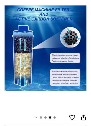 Vendo filtro de agua para cafetera, nuevo. Ideal para mejorar el sabor del café y prolongar la vida útil de tu máquina. paquete de tres unidades de filtro. - Reduce cloro, metales pesados y otros contaminantes. - Mantiene minerales y flúor beneficiosos. - Contiene resina de intercambio iónico y carbón activado. - Estabiliza el carbonato de calcio y elimina impurezas.
