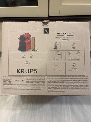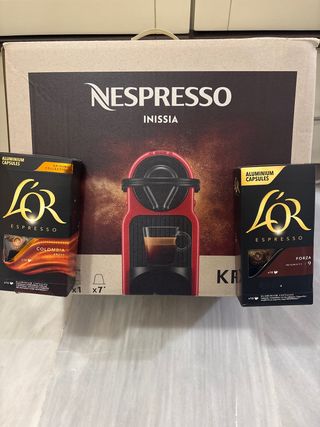 Se vende cafetera Nespresso Inissia en color rojo, junto con dos cajas de cápsulas L'OR. - Cafetera Nespresso Inissia. - Caja de cápsulas L'OR Espresso Colombia Andes (10 cápsulas). - Caja de cápsulas L'OR Espresso Forza (10 cápsulas).