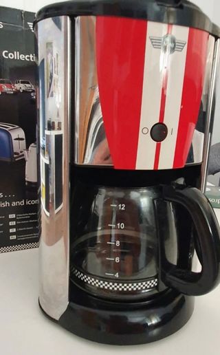 Cafetera de filtro con un diseño inspirado en Mini Cooper. Cuenta con un acabado cromado y detalles en rojo y blanco. - Diseño Mini Cooper. - Acabado cromado. - Detalles en rojo y blanco.