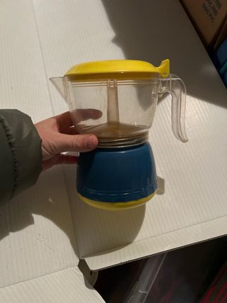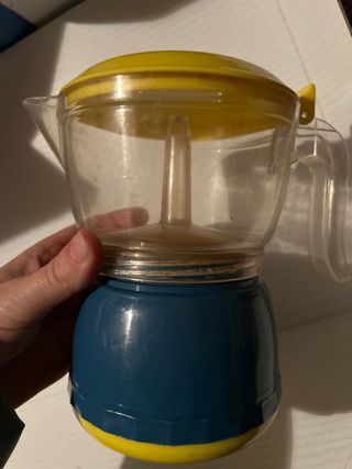 Cafetera estilo moka con cuerpo transparente y base azul. - Tapa y asa de plástico amarillo. - Diseño moderno y funcional.