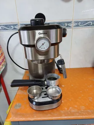 Cafetera espresso de la marca Cecotec, modelo Cumbia Cafelizzia. - Diseño moderno en acero inoxidable. - Manómetro para control de presión. - Incluye portafiltros y accesorios.