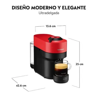 Cafetera Nespresso Vertuo en un llamativo color rojo. Su diseño moderno y elegante la hace destacar. - Diseño ultradelgado. - Dimensiones: 13.6 cm (ancho) x 25 cm (alto) x 42.6 cm (profundidad).