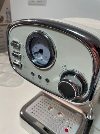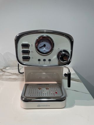 Cafetera de la marca Mandine en color crema y con detalles cromados. Su diseño retro le da un toque elegante a tu cocina. - Acabado en crema y cromo. - Indicador de temperatura. - Bandeja de goteo extraíble.