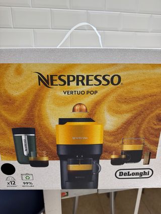 Cafetera Nespresso Vertuo Pop de la marca DeLonghi. - Modelo Vertuo Pop. - Incluye 12 cápsulas de café ofrecidas. - Fabricada con un 99% de materiales reciclables.