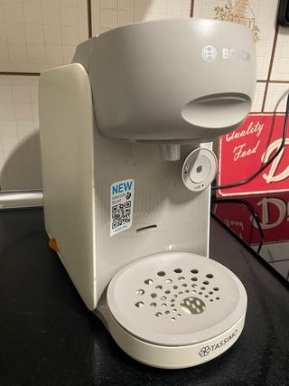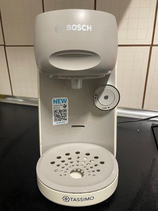 Cafetera compacta de la marca Bosch, modelo Tassimo. Su diseño moderno y color neutro la hacen ideal para cualquier cocina. - Marca: Bosch - Modelo: Tassimo - Color: Blanco/Gris claro - Incluye soporte para tazas ajustable. - Tiene un pequeño quemado en el lateral pero funciona perfectamente