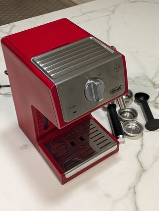 Cafetera espresso DeLonghi de color rojo y acabado cromado. Incluye accesorios para preparar café. - Cafetera espresso. - Color rojo. - Incluye portafiltro y cucharilla medidora.