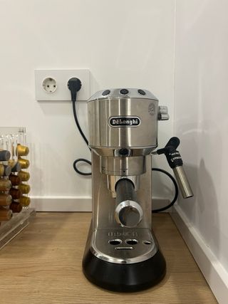 Cafetera express de la marca De'Longhi, con un acabado en acero inoxidable. - Diseño moderno y compacto. - Incluye vaporizador para leche. Cafetera express - De'Longhi Dedica EC685.M, 1300 W, 15 bar, Thermoblock, Espresso manual, Función 2 tazas, Metalizado