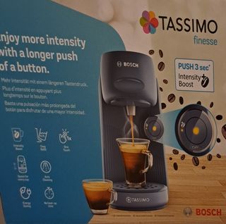 Cafetera Tassimo Finesse, en su caja original. Es de color gris y blanco, y tiene un diseño elegante y compacto. - Modelo: Tassimo Finesse - Marca: Bosch - Incluye la cafetera y su caja.