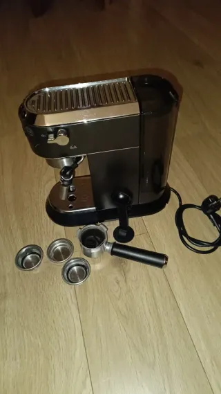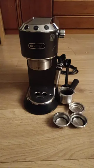 Cafetera espresso DeLonghi Dedica en color negro. - Diseño compacto y elegante. - Incluye portafiltros y accesorios. - Acabado metálico.