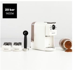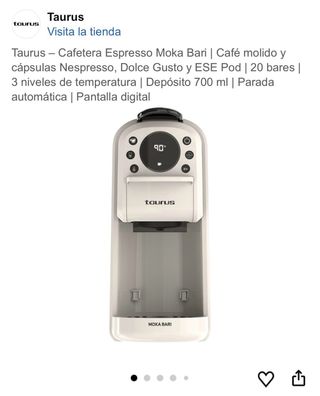 Cafetera Espresso Taurus Moka Bari en color blanco. Compatible con café molido y cápsulas Nespresso y Dolce gusto - Presión de 20 bares. - Depósito de agua de 700 ml. - 3 niveles de temperatura. - Parada automática. - Pantalla digital.