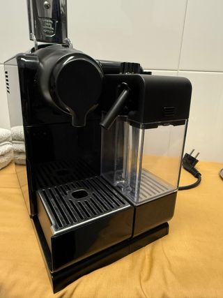 Cafetera Nespresso en color negro, con un diseño moderno y compacto. Ideal para preparar tu café favorito. - Incluye cajón para cápsulas y varias cápsulas que compré hace poco. - Depósito de agua extraíble. - Permite hacer Capuchino con depósito para leche Modelo EN550.B Lattissima Touch Nespresso Delongui Está en muy buen estado.