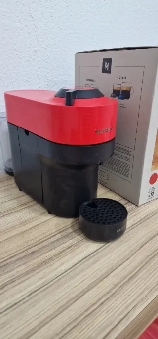 Cafetera Nespresso Krups en color rojo. Está en buen estado. - Modelo compacto y fácil de usar. - Diseño elegante y moderno. - Incluye una bandeja recogegotas. Tiene un fallo que al salir el café derrama agua por abajo. Hemos estado leyendo y debe ser un problema de obstrucción de la salida de las cápsulas que suele tener arreglo