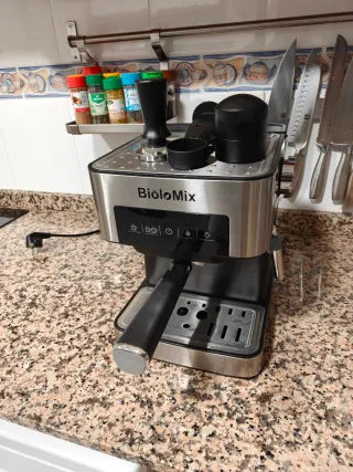 Cafetera espresso de la marca BioloMix, con un diseño moderno y acabado en acero inoxidable. Incluye portafiltros grande y pequeño, tamper de muelle y rejilla de acero para la correcta distribución del agua. - Panel de control con botones. - Bandeja de goteo extraíble.