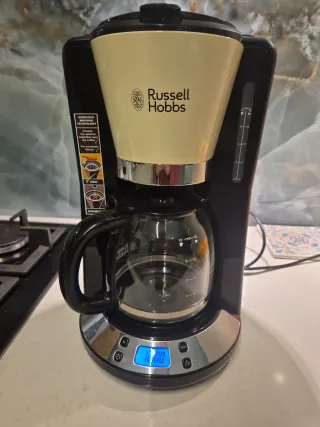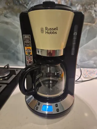 Cafetera de goteo Russell Hobbs en color beige y negro. Cuenta con tecnología Whirltech Brewing para un café óptimo. Funciona pero hay señales de uso - Jarra de cristal. - Indicador de nivel de agua. - Panel de control digital.