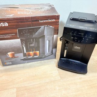 Cafetera Superautomática Ufesa Supreme Barista de 1550W (buen estado, pequeño detalle: pequeñas marcas de uso). Cuenta con 20 bares de presión, panel táctil intuitivo y molinillo incorporado, además de tecnología patentada para ajustar el grosor del café. Ofrece una experiencia de café personalizada con su sistema de molienda y ajuste de intensidad. Ideal para preparar espresso, cappuccino y otras bebidas con calidad de cafetería en la comodidad de tu hogar. LPNHK347014188 ufesa, supreme, barista, cafetera, superautomática, bares, panel, táctil, oferta, nuevo.