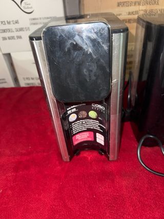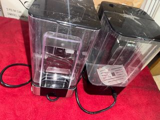 Se venden dos cafeteras de plástico transparente con detalles en negro y morado. Ideales para tu cocina. - Depósito de agua extraíble. - Bandeja recogegotas. - Diseño moderno.
