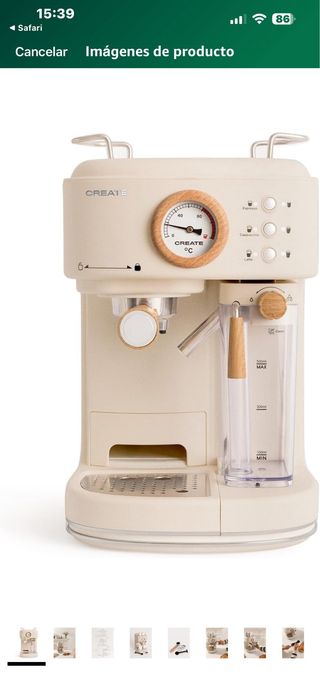 Cafetera semiautomática de la marca Create, en perfecto estado y con muy poco uso. Su diseño es moderno y elegante, ideal para preparar tus cafés favoritos en casa. Conservo la caja - Color: crema. - Incluye accesorios. - Fácil de usar y limpiar.