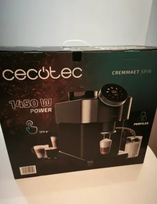 Cafetera superautomática táctil Cremmaet Spin táctil de Cecotec con 19 bares y sistema Thermoblock. PRÁCTICAMENTE NUEVA. Se entrega en su caja del fabricante, se ha probado y hecho muy pocos cafés, tanque de leche de vidrio sin estrenar. Mas de dos año de GARANTÍA. Precio actual en tienda: 499€. Café recién molido al instante conservando todo el sabor del grano y sus matices. Sistema de limpieza automático, potencia 1450 W, sistema de calentamiento rápido Thermoblock, molinillo cerámico integrado con 9 niveles de molienda, pantalla táctil 4", personalizable hasta 6 usuarios y con 7 menús, depósito de café hermético.