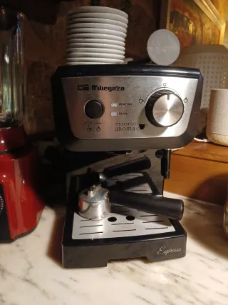 Cafetera espresso de la marca Orbegozo, modelo Máximo Aroma. - Diseño moderno en color negro y plateado. - Indicadores luminosos de Heating y Ready. - Panel de control con dial giratorio. - Bandeja de goteo extraíble.
